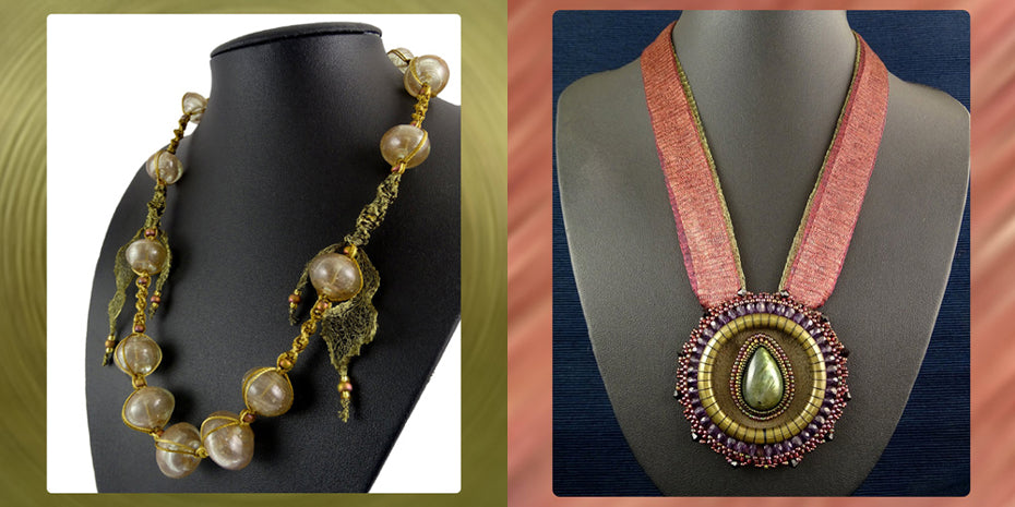Our own hand-made beaded-bead focal and accent beads are strung on silk-stuffed Italian Wire Mesh Ribbon. Swarovski Crystal Pearls in a rich warm Fuchsia are combined with Italian Wire Mesh ribbon to create woven macramè decorative accents. Finished with hand-made...