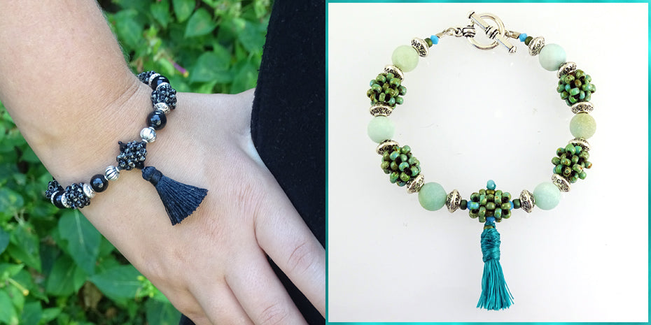 Semi-precious black obsidian is combined with our own hand-woven "berry beads" in Picasso black tones. Hand-crafted "guru" bead with Swarovski crystal accents and silky hand-made tassel. Finished with high quality sterling silver-plated accents and toggle clasp. This bracelet is approx....